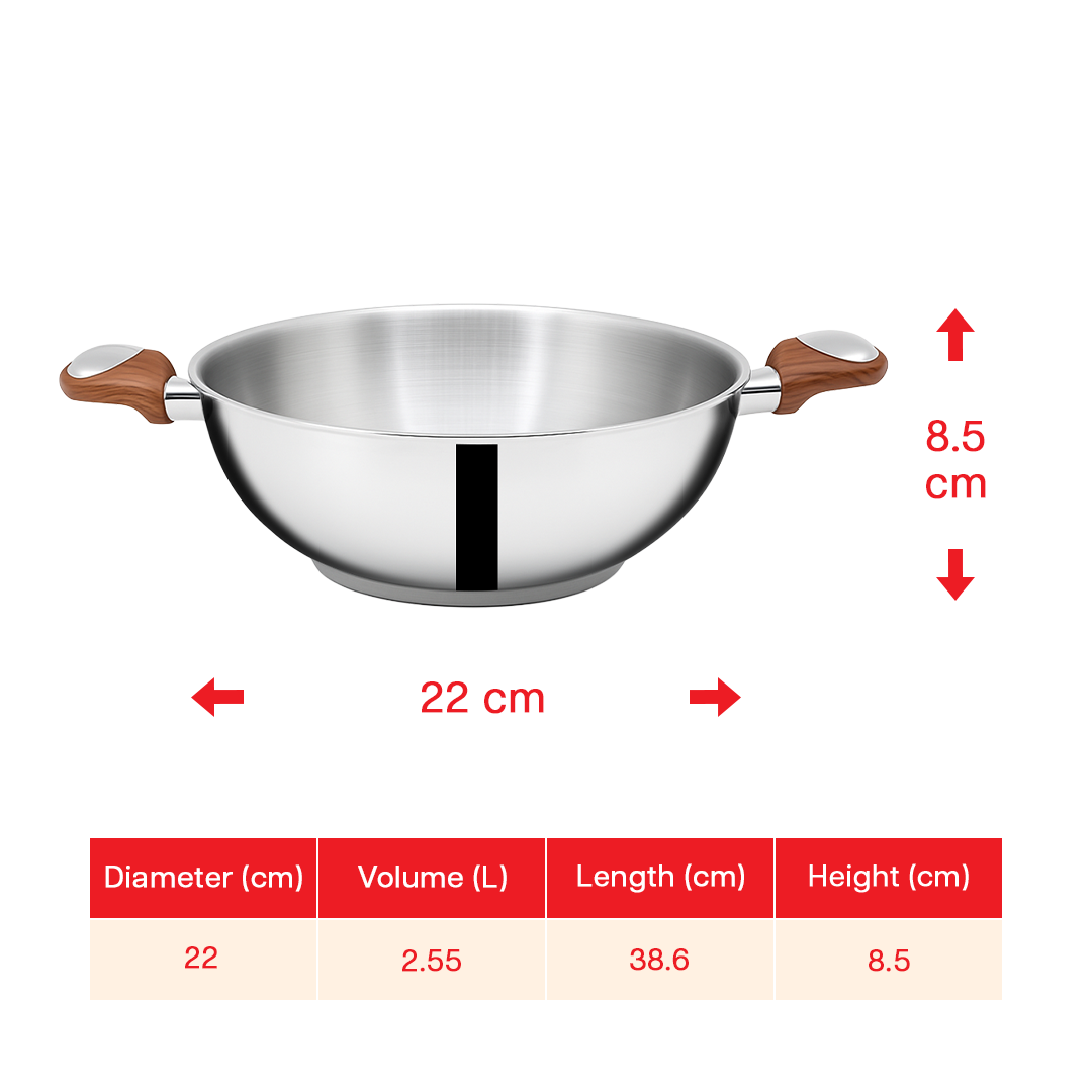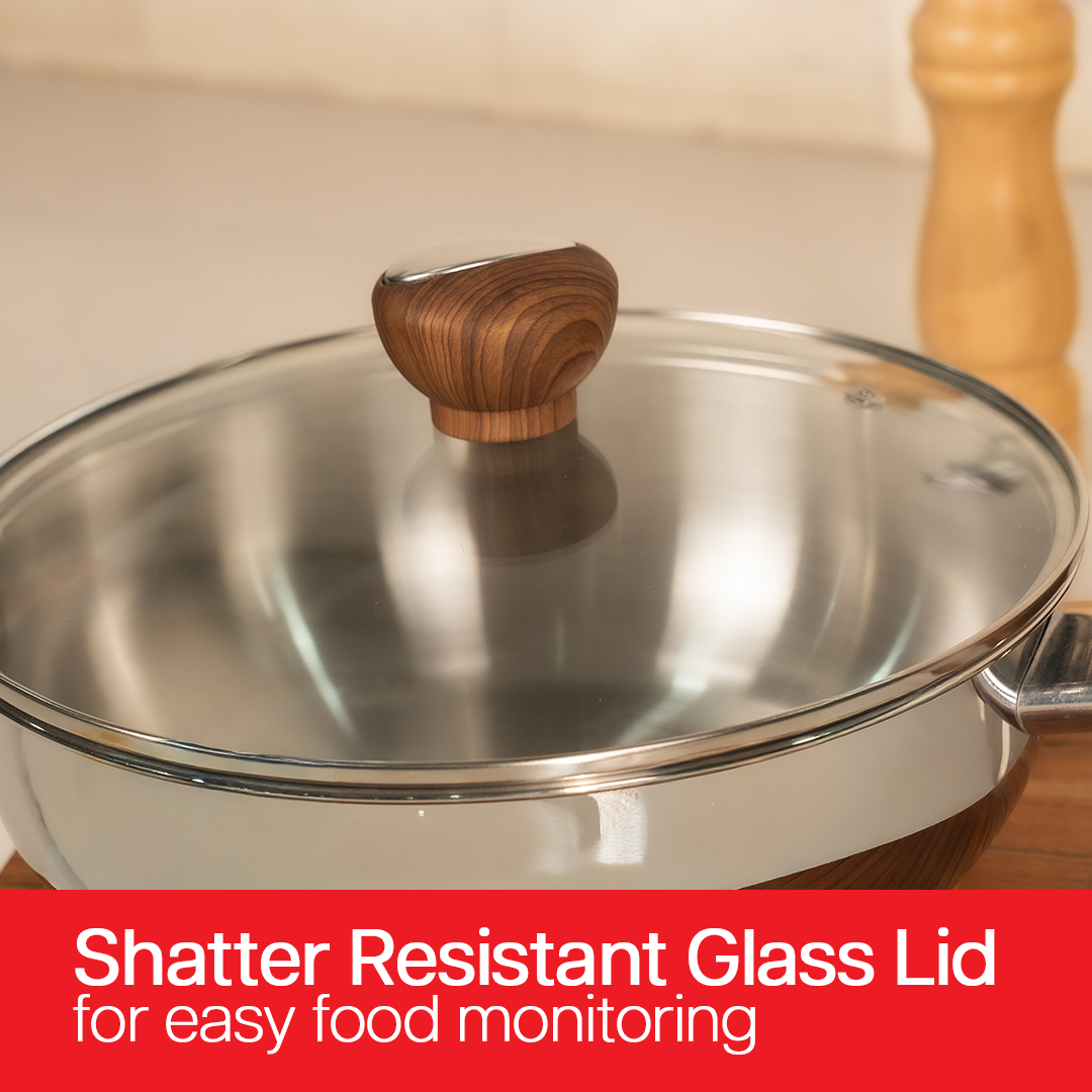 The Suncasa Impact Pro Luxe Kadhai combines premium performance with timeless design. Made from 304 food-grade stainless steel, it features an impact forged base of 304 food safe stainless steel, aluminum, and 430 magnetic steel for even heat distribution and faster cooking without burning. The deep kadhai paired with a sturdy wooden-finish handle ensures ergonomic comfort, while the tempered glass lid lets you monitor your cooking with ease. ISI certified, dishwasher safe, and 100% food safe, this kadhai is compatible with gas, induction, and other cooktops. It's perfect for everyday cooking with style and durability.
