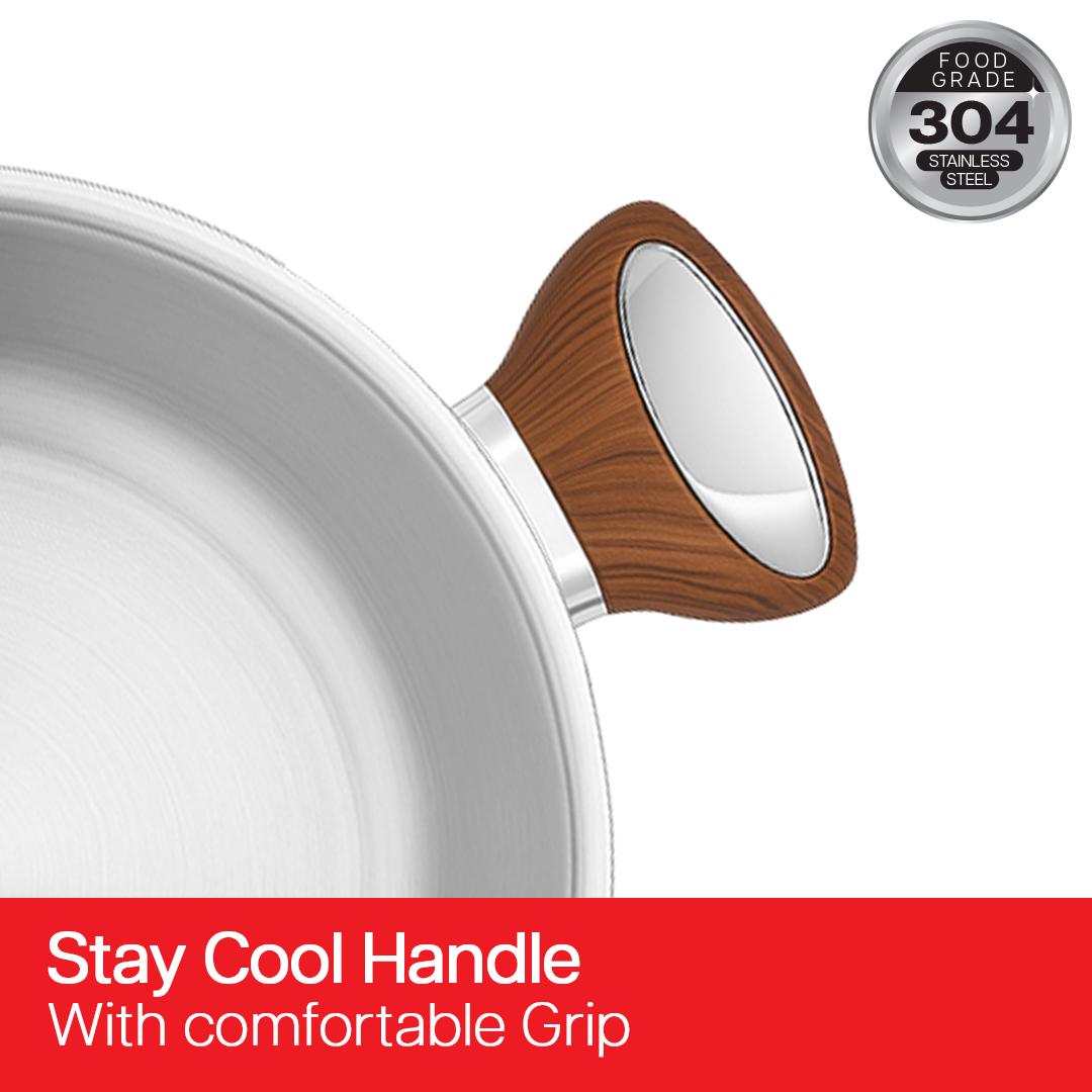 - Features an impact-forged tri-ply base- 304 stainless steel, aluminum, and 430 magnetic steel; for even heat distribution and faster cooking without burning