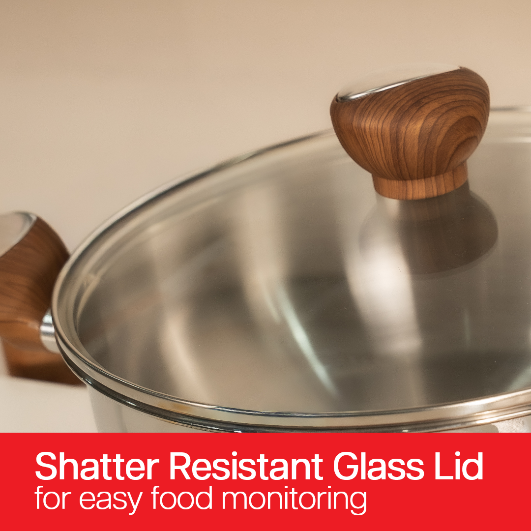 - Tempered glass lid allows easy monitoring while retaining heat and flavour