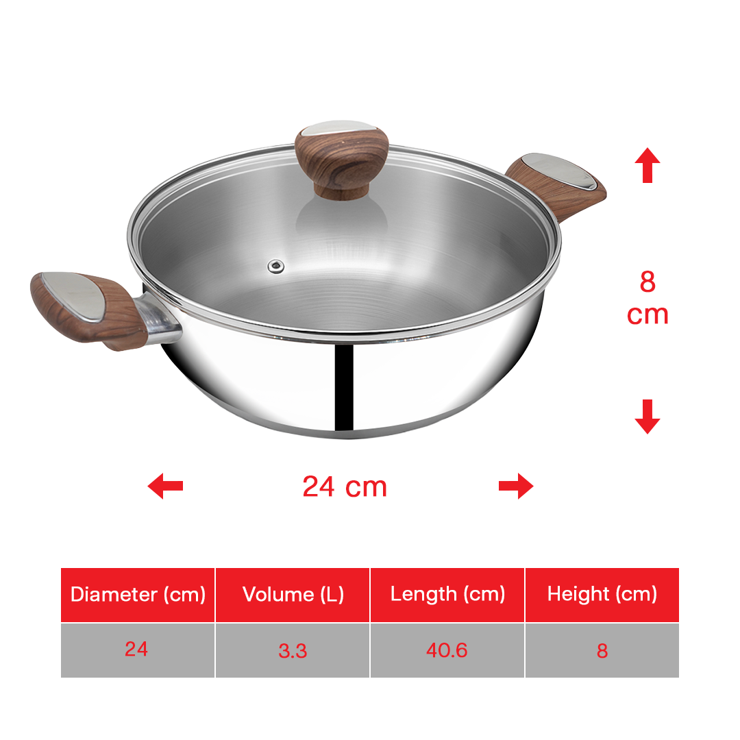 SUNCASA Impact Pro Luxe Flat Bottom Kadai with Glass Lid, 24 cm