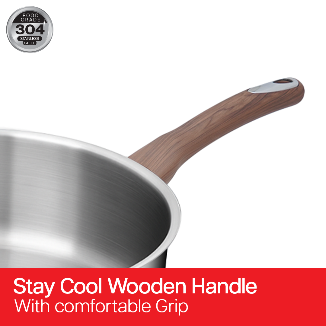 - Features an impact-forged tri-ply base - 304 stainless steel, aluminum, and 430 magnetic steel - for even heat distribution and faster cooking without burning