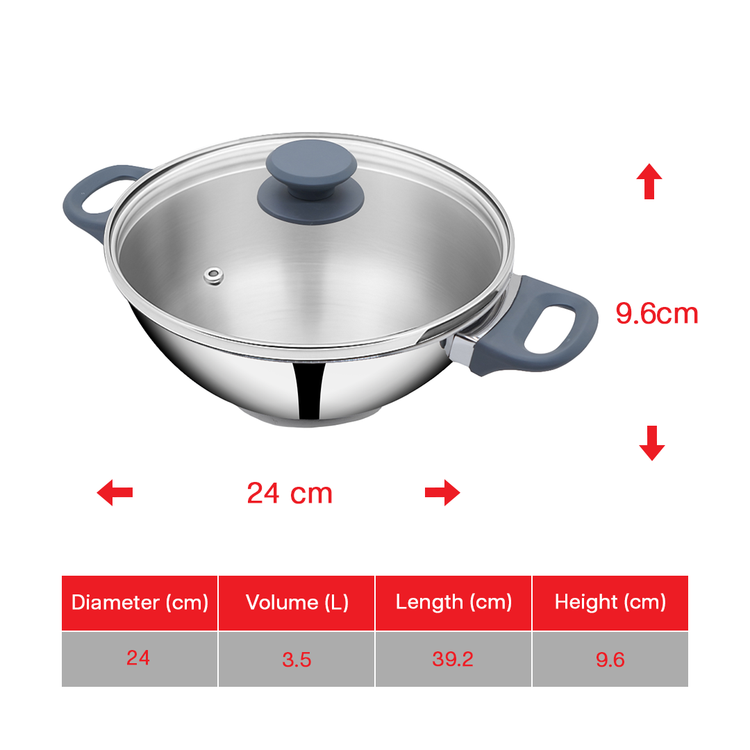 SUNCASA Impact Pro Stainless Steel Deep Kadai with Glass Lid, 24cm