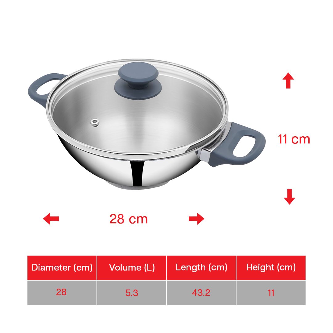 SUNCASA Impact Pro Stainless Steel Deep Kadai with Glass Lid, 28cm