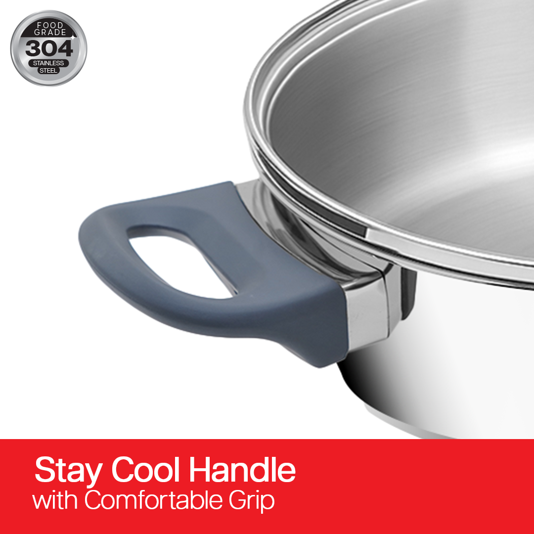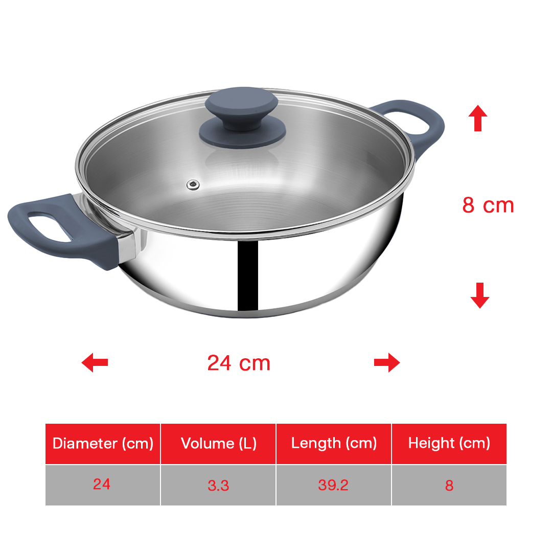SUNCASA Impact Pro Stainless Steel Flat Bottom Kadai with Glass Lid, 24cm