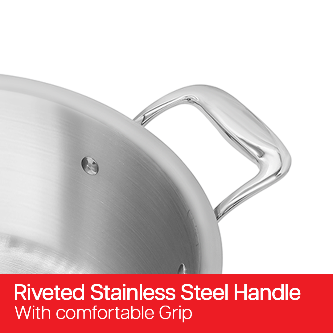 - Triply (Three Layer Clad Metal) construction featuring: (304 food-grade stainless steel, Aluminum core for faster, even heating, 430 magnetic stainless steel for induction compatibility).